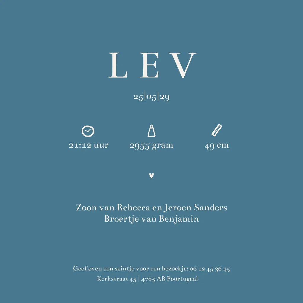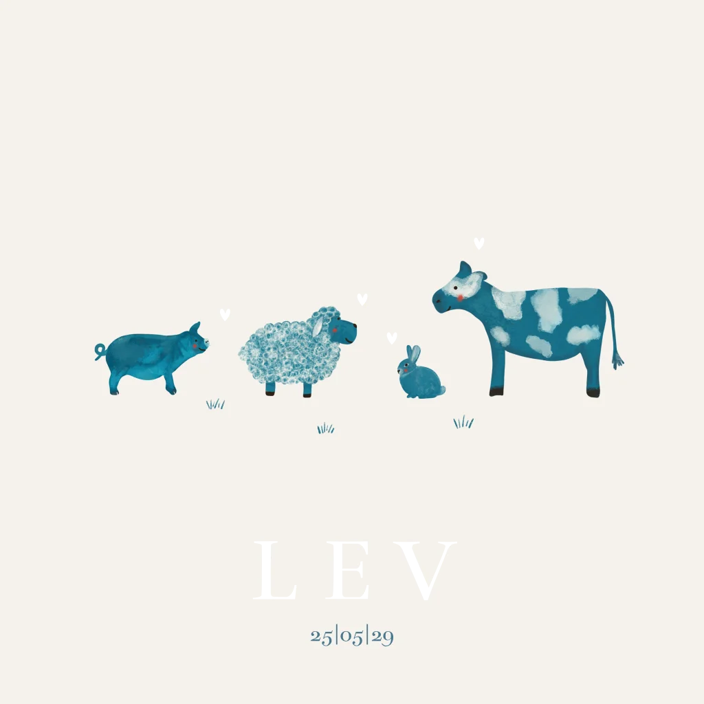 Met deze leuke boerderijdieren op het geboortekaartje tover je een lach op ieders gezicht. Het geboortekaartje heeft een zachte uitstraling. Liever geen biggetje op het geboortekaartje? Open de online editor en pas het gemakkelijk naar wens aan.