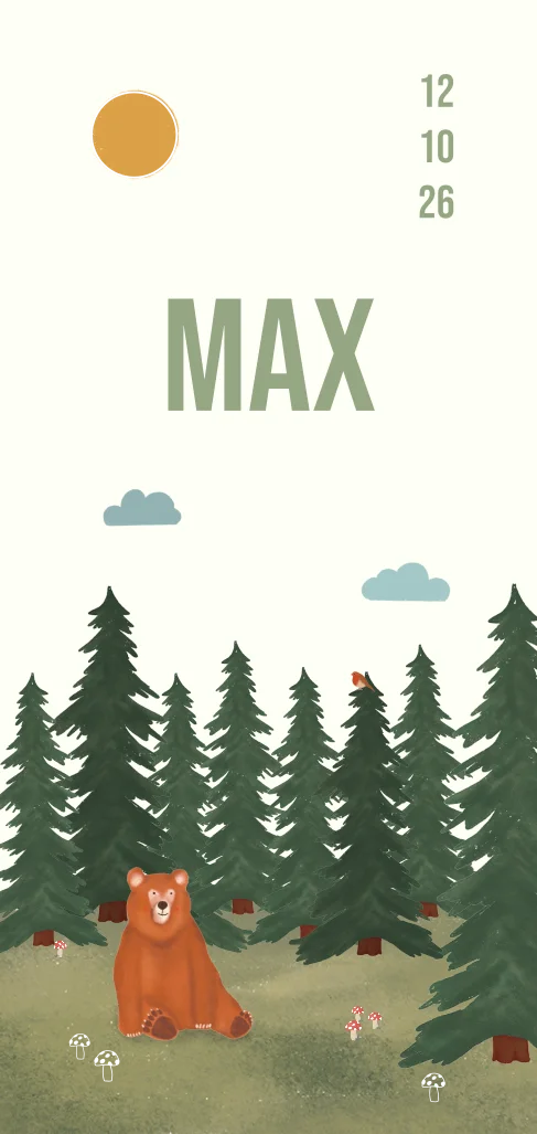 Een lief geboortekaartje in het bos, met een schattige beer en mooie paddestoelen. Het kaartje is extra bijzonder door de subtiele goudfolie details rond de zon en de paddestoelen. Pas het ontwerp naar wens aan in de online editor.