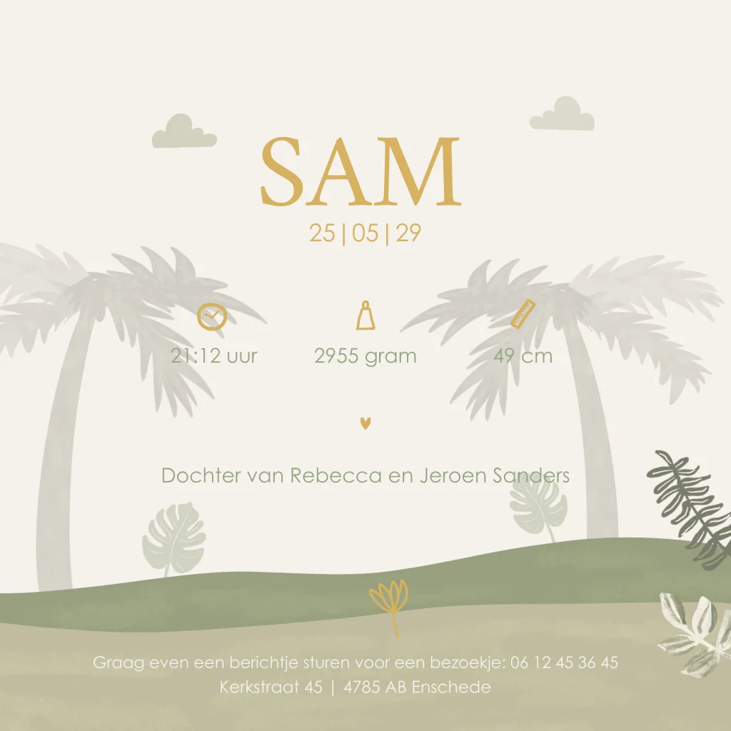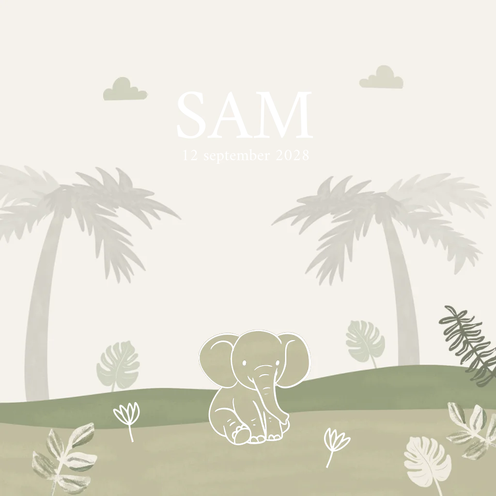 Geboortekaartje olifant groen palmbomen safari