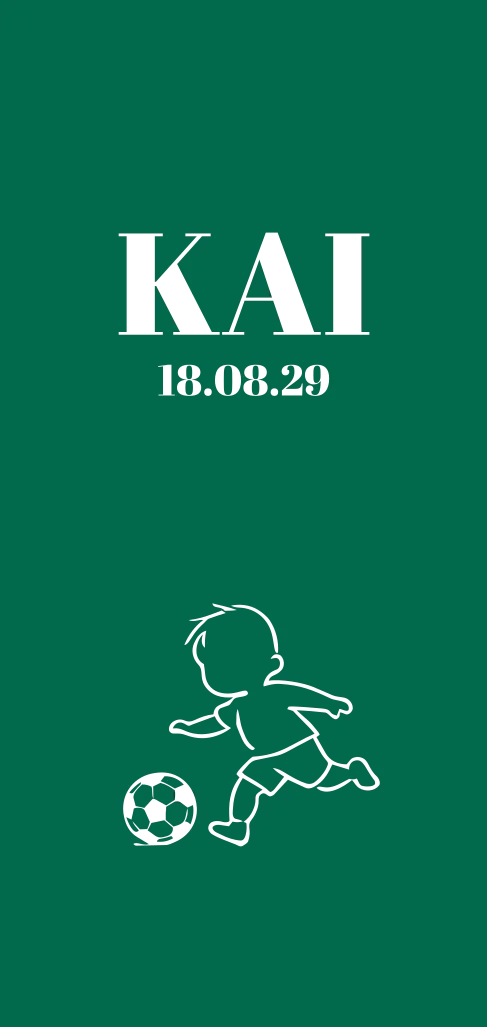 Uniek en stoer geboortekaartje in een mooie langwerpige vorm met en subtiele voetballend jongetje. Tip: Grote liefde voor de sport? Pas de kleuren volledig aan naar jullie eigen clubkleuren en maak het kaartje écht persoonlijk.