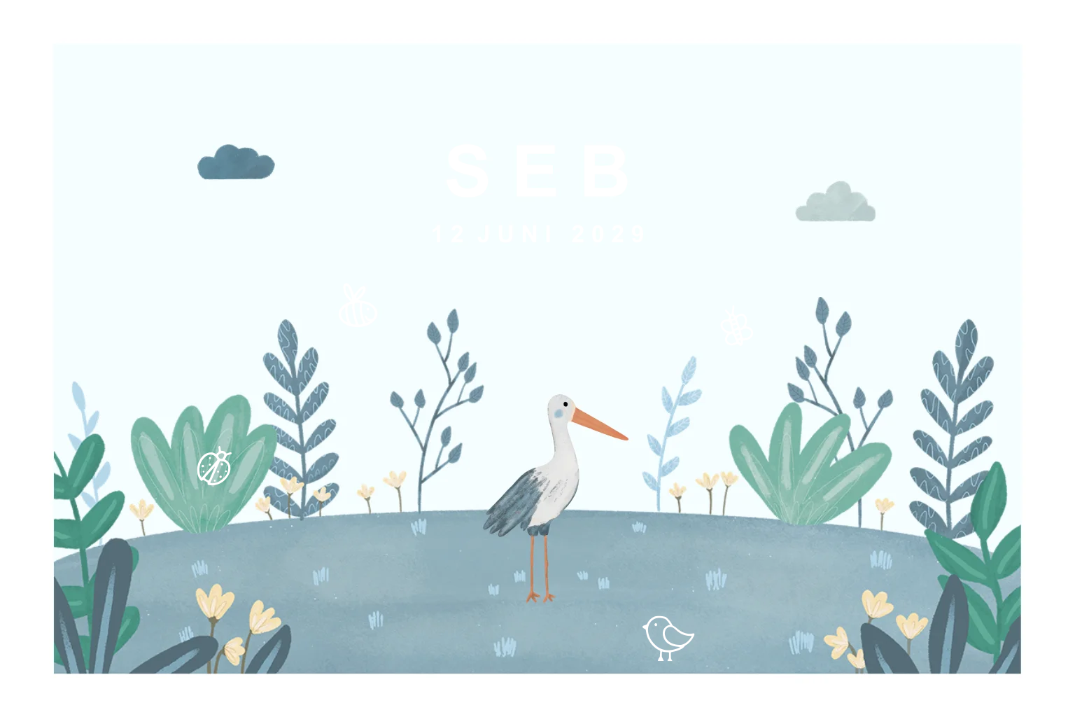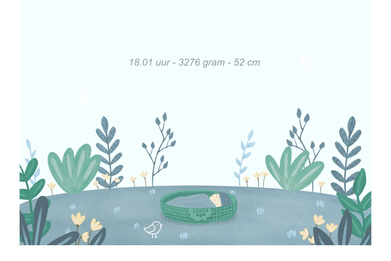 Vier de geboorte van jullie zoon met dit warme en liefdevolle geboortekaartje. De zachte kleuren, speelse bloemen en de illustratie van de ooievaar en aan de binnenzijde van het mandje met baby maken dit kaartje extra bijzonder en persoonlijk.