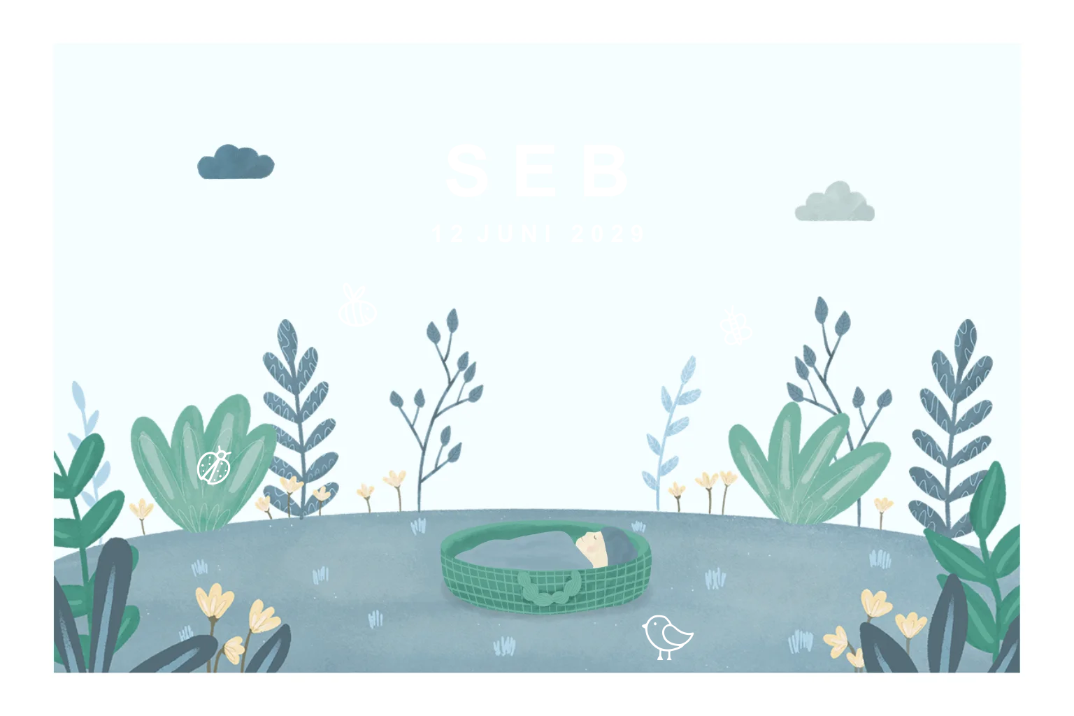 Vier de geboorte van jullie zoon met dit warme en liefdevolle geboortekaartje. De zachte kleuren, speelse bloemen en de illustratie wiegje/mandje maken dit kaartje extra bijzonder en persoonlijk.