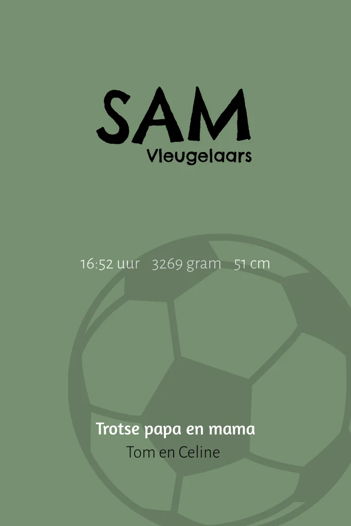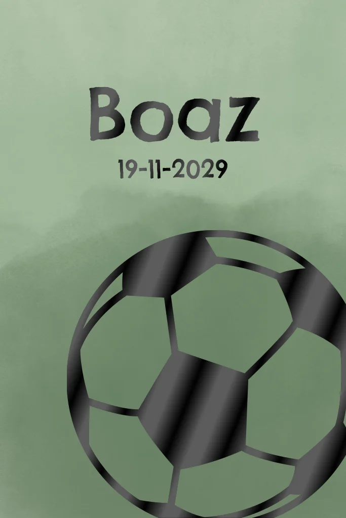 Stoer en stijlvol geboortekaartje met een grote minimalistische voetbal in modern groen. Dit eigentijdse babykaartje is perfect voor kleine voetbalfans en sportieve ouders. De rustige typografie in combinatie met het grafische design geeft een trendy en tijdloze uitstraling. Ideaal als geboortekaartje voor een jongen met een liefde voor voetbal.