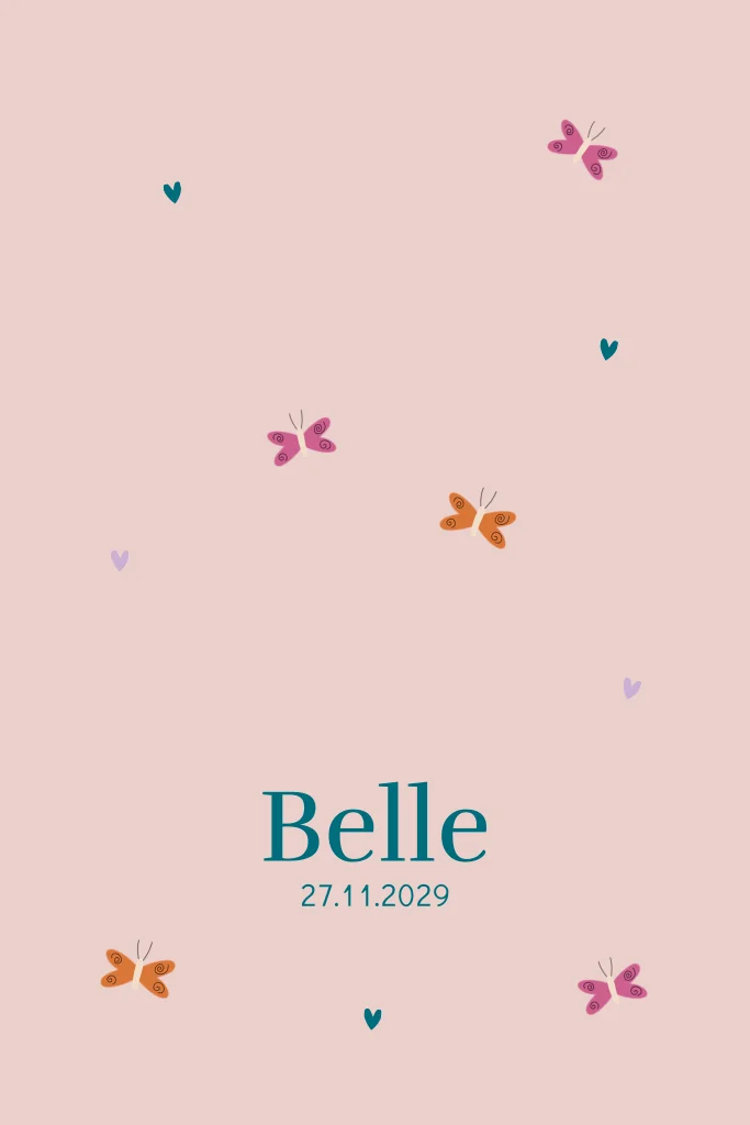 Op zoek naar een lief en stijlvol geboortekaartje voor jullie dochter? Dit beige geboortekaartje met vrolijke vlinders straalt zachtheid, warmte en speelsheid uit. De subtiele aardetint in combinatie met kleurrijke vlindertjes en kleine hartjes maakt dit ontwerp perfect voor ouders die houden van een moderne, maar lieve uitstraling.