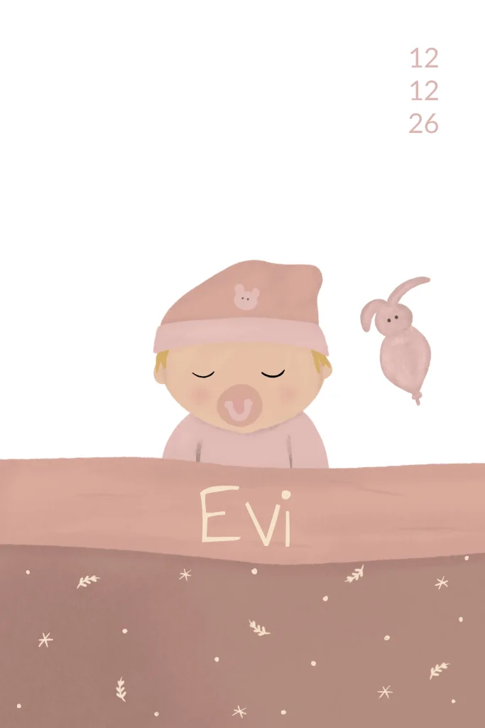 Lief geboortekaartje met baby in bedje in lila met een knuffeldoekje. Personaliseer eenvoudig met onze online editor.