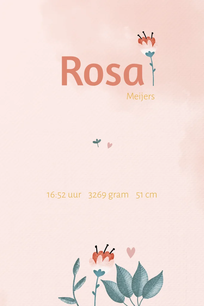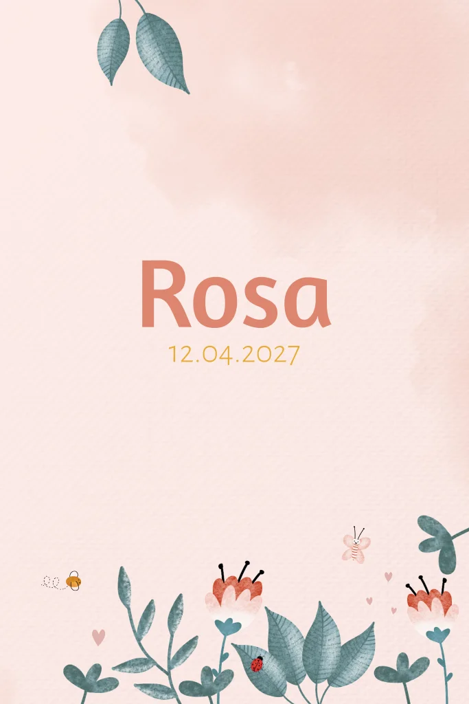 Een lief en vrolijk geboortekaartje met bladeren, bloemen, bijtje, vlinder en lieveheersbeestje. Pas het kaartje eenvoudig naar wens aan in onze editor.