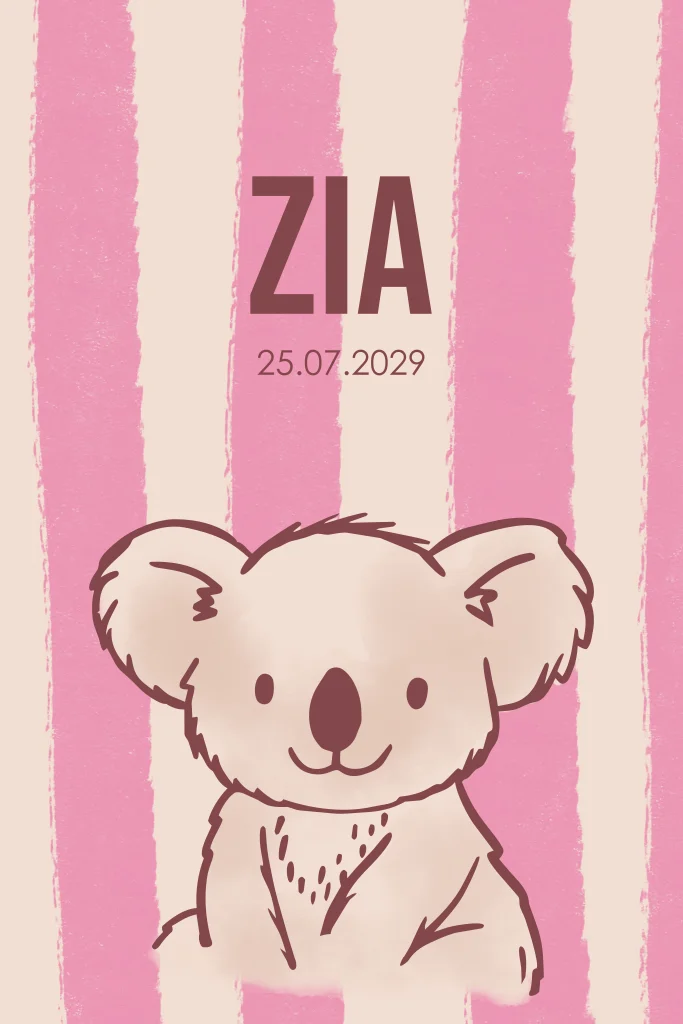 Lief geboortekaartje met koala en roze strepen. Pas het ontwerp aan in onze online editor.