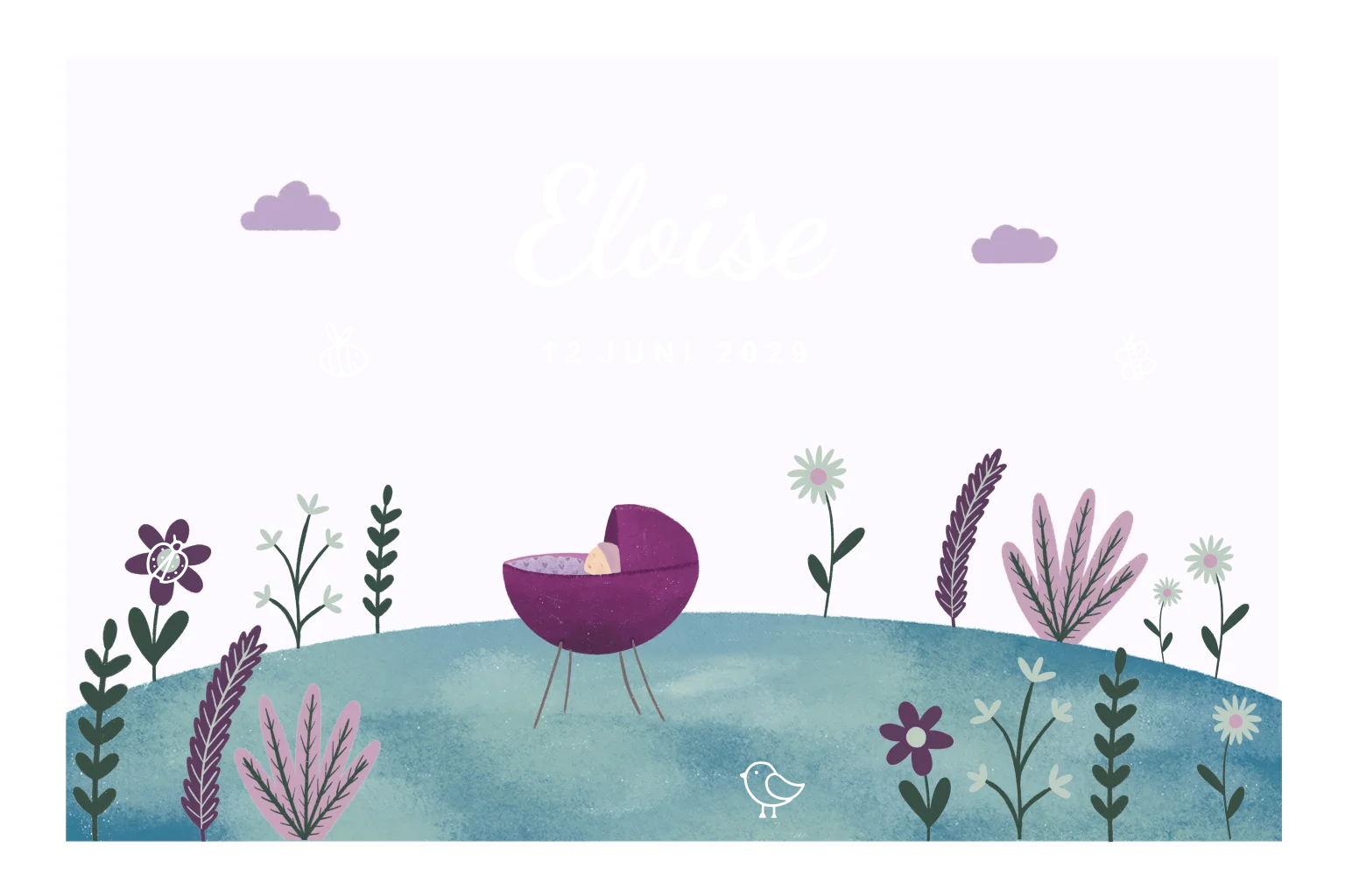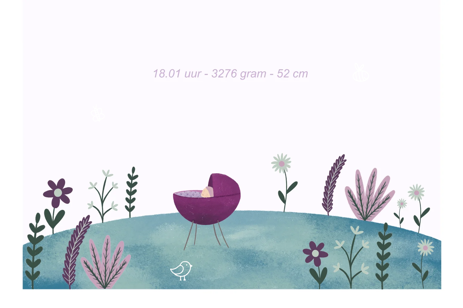 Vier de geboorte van jullie dochter met dit warme en liefdevolle geboortekaartje. De zachte kleuren, speelse bloemen en de illustratie van het wiegje maakt dit kaartje extra bijzonder en persoonlijk.