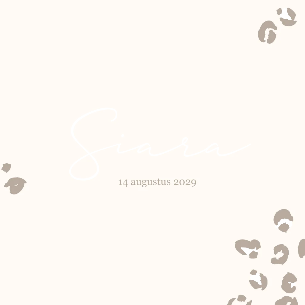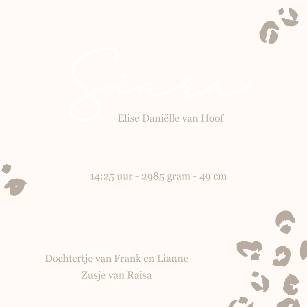 Mooi geboortekaartje met panterprint in subtiele beige kleuren. Door de subtiele goudfolie details heeft het kaartje een luxe uitstraling. De tekst is helemaal naar wens aan te passen in de editor. Wil je andere kleuren? Neem dan even via mail contact op!