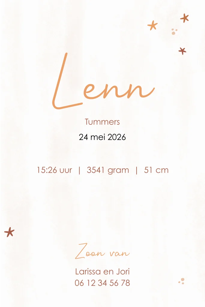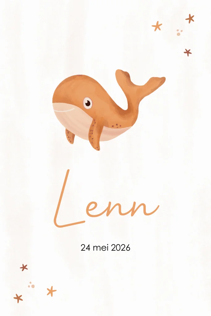 Lief geboortekaartje met oranje aquarel walvis en zeesterren. Pas het ontwerp gemakkelijk aan in de online editor.