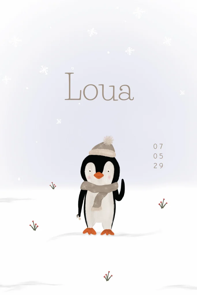 Vrolijk geboortekaartje met schattige pinguïn met muts, sjaal en speentje. Personaliseer eenvoudig in onze online editor.