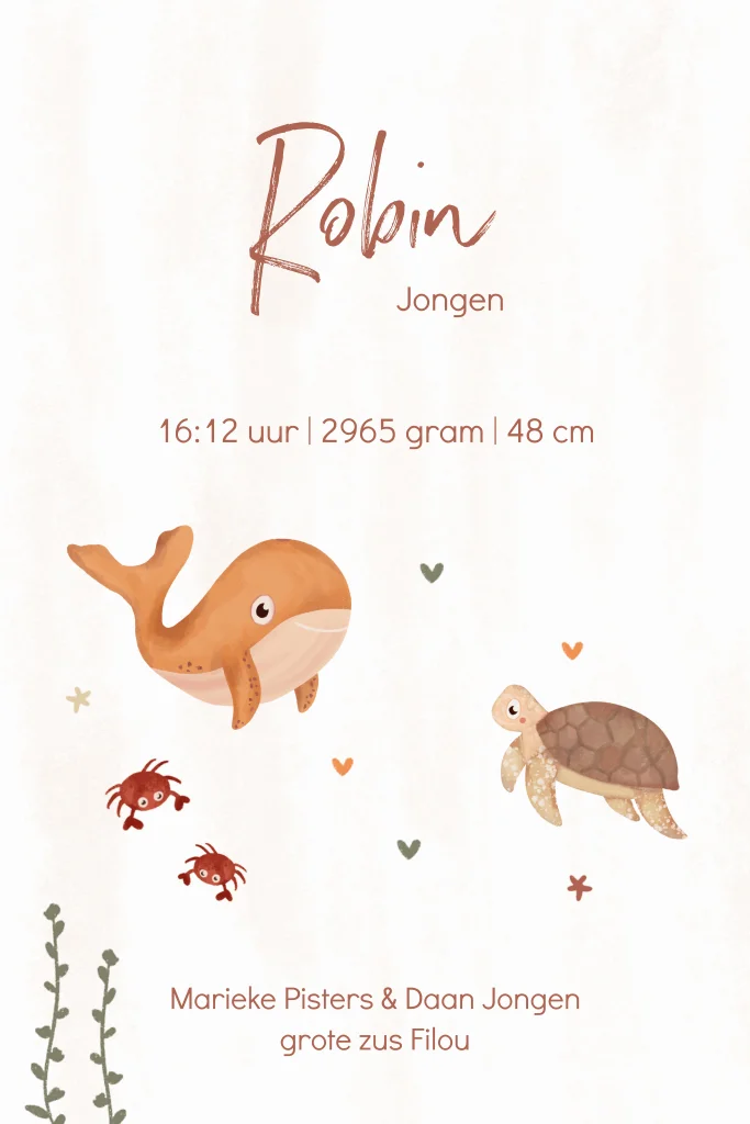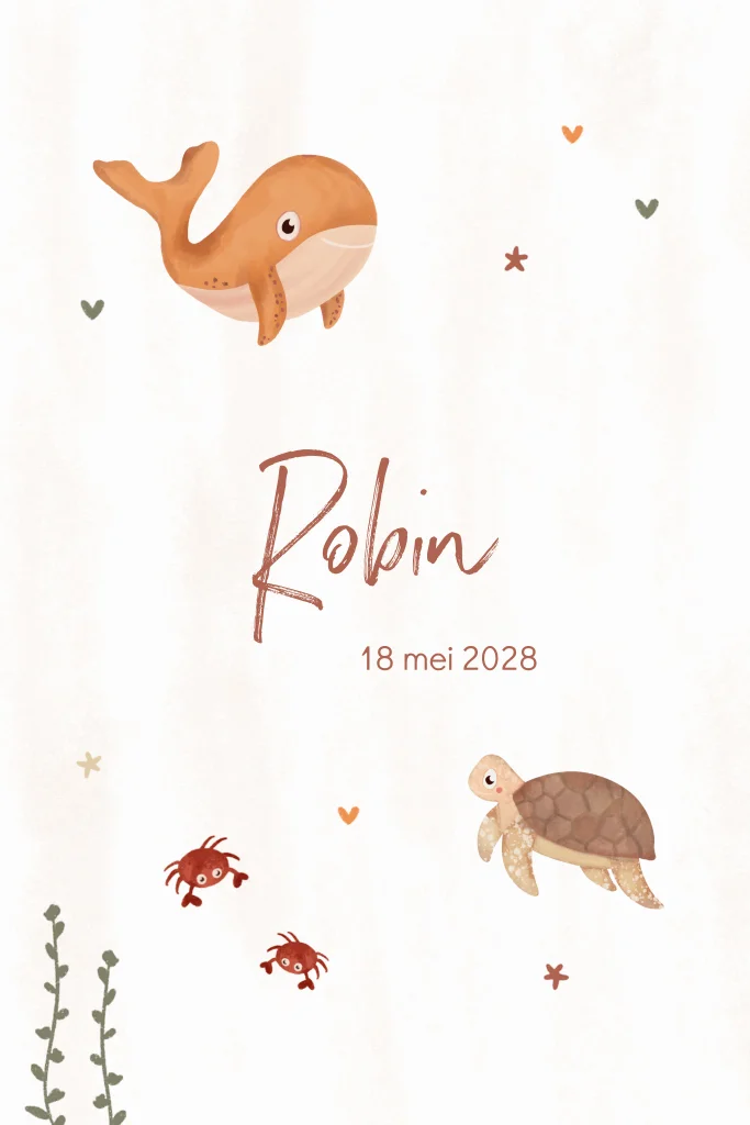 Een lief geboortekaartje met walvis, schildpad en krabbetjes in waterverf. De ronde hoeken geven een luxe uitstraling aan het kaartje. Geheel naar wens te personaliseren in de editor.