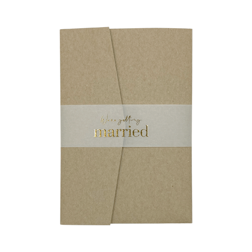 Bellyband van kalkpapier met goudfolie tekst we're getting married. Gaaf om een pocketfold of om een set kaarten. Gemakkelijk vast te maken met een mooie sluitzegel.