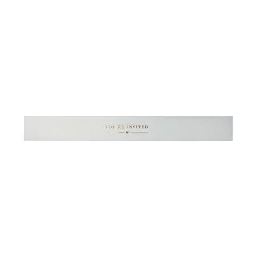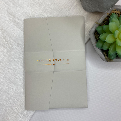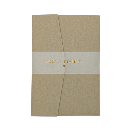 Bellyband van kalkpapier met koperfolie tekst You're invited . Gaaf om een pocketfold of om een set kaarten. Gemakkelijk vast te maken met een mooie sluitzegel.