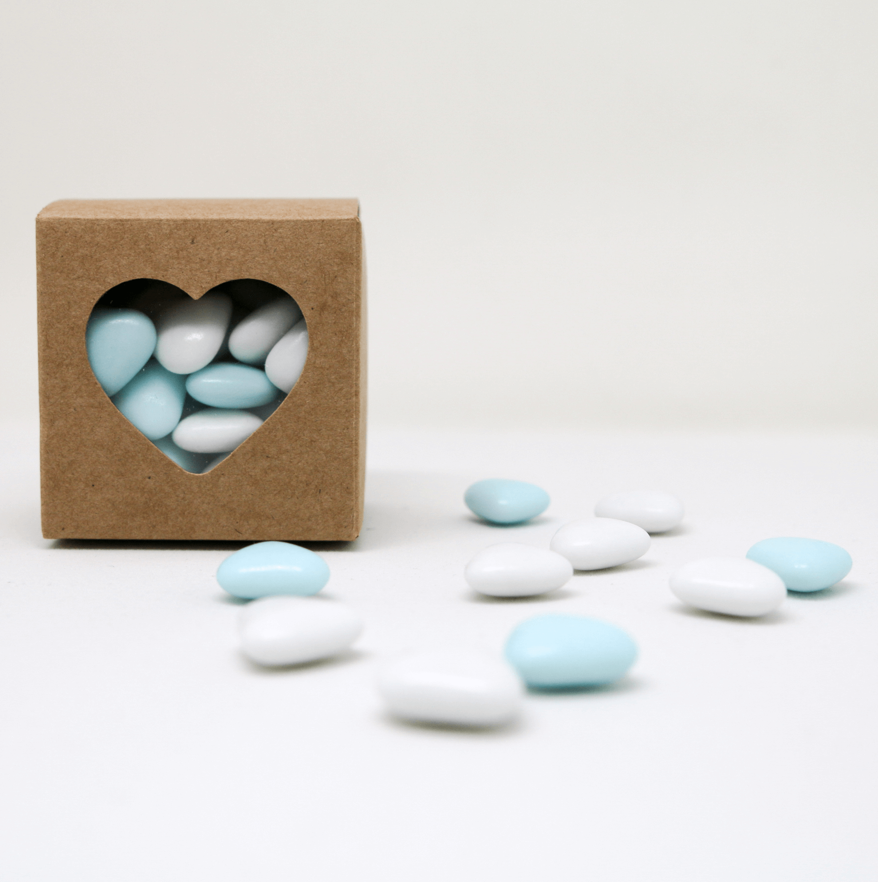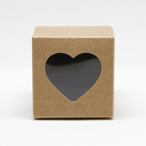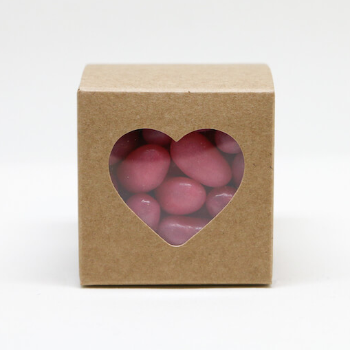 Kraft doosje met hartjesuitsnede. Ideaal als geboortebedankje voor kraambezoek of na een communie of bruiloft. Het doosje is 5 cm hoog, breed en diep en wordt ongevouwen en leeg geleverd.