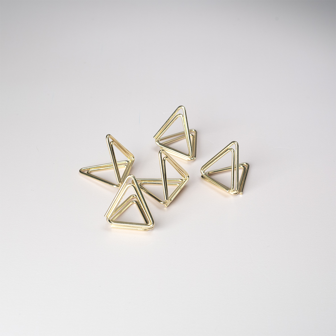 Driehoekvormige, gouden naamkaarthouders (10 stuks). Formaat: 2 cm (breedte) x 2 cm (hoogte).