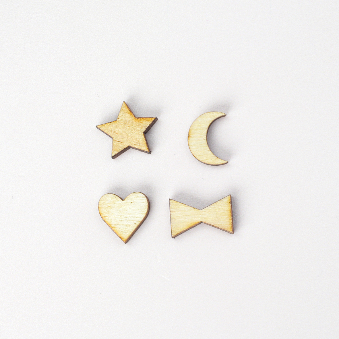 Sampleset van een houten hartje, sterretje, strikje en maantje.