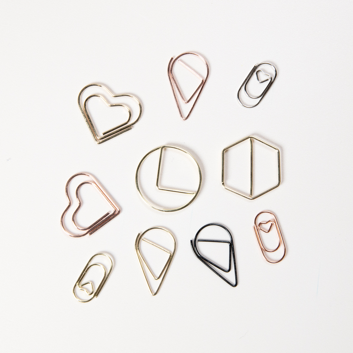 Sampleset van tien soorten paperclips in verschillende vormen en kleuren.