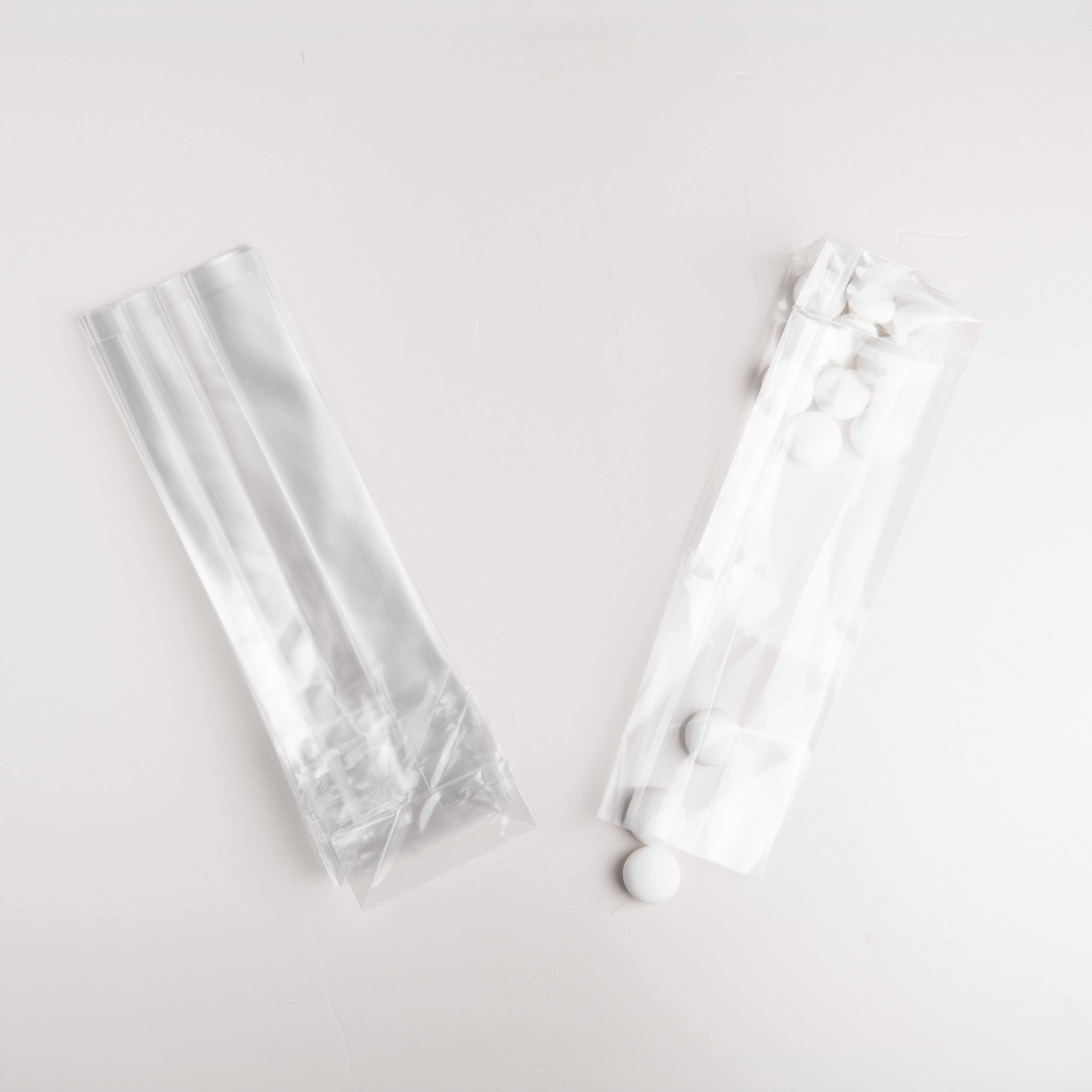Transparante blokbodemzakjes (10 stuks). Formaat: 6 cm (breedte) x 17 cm (hoogte) x 5 cm (diepte).